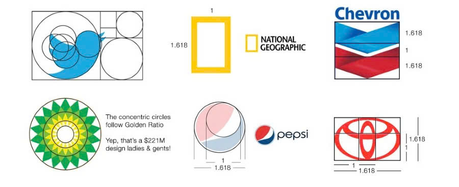- Logo Pepsi: hai vòng tròn theo tỷ lệ 1:1,618.